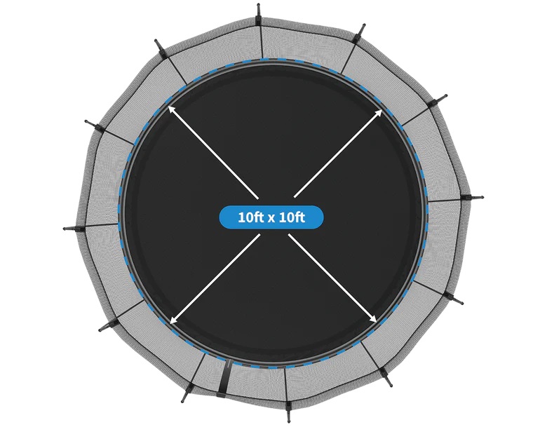 The jumping surface of our 10ft round trampoline is equivalent to that of a 12ft round trampoline with springs.