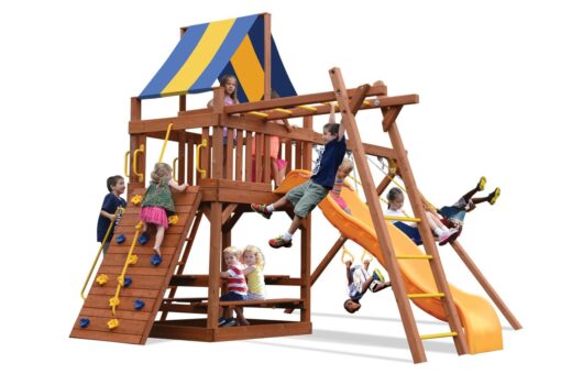 Includes: Heavy duty canopy roof, 10′ wave slide, rockwall with climbing rope, step ladder with handrails, 3 position swing beam with 2 belt swings and a trapeze bar, 3 in 1 picnic table, monkey bars, ships wheel and safety handles.
