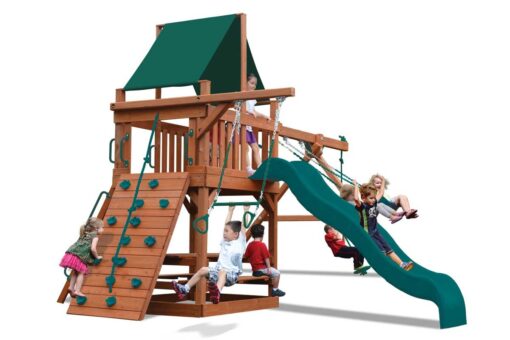 Includes: Heavy duty canopy roof, 10′ wave slide, rockwall with climbing rope, step ladder with handrails, 3 position swing beam with 2 belt swings and knotted rope with disc, accessory arm with trapeze bar, 3 in 1 picnic table, ships wheel and safety handles.