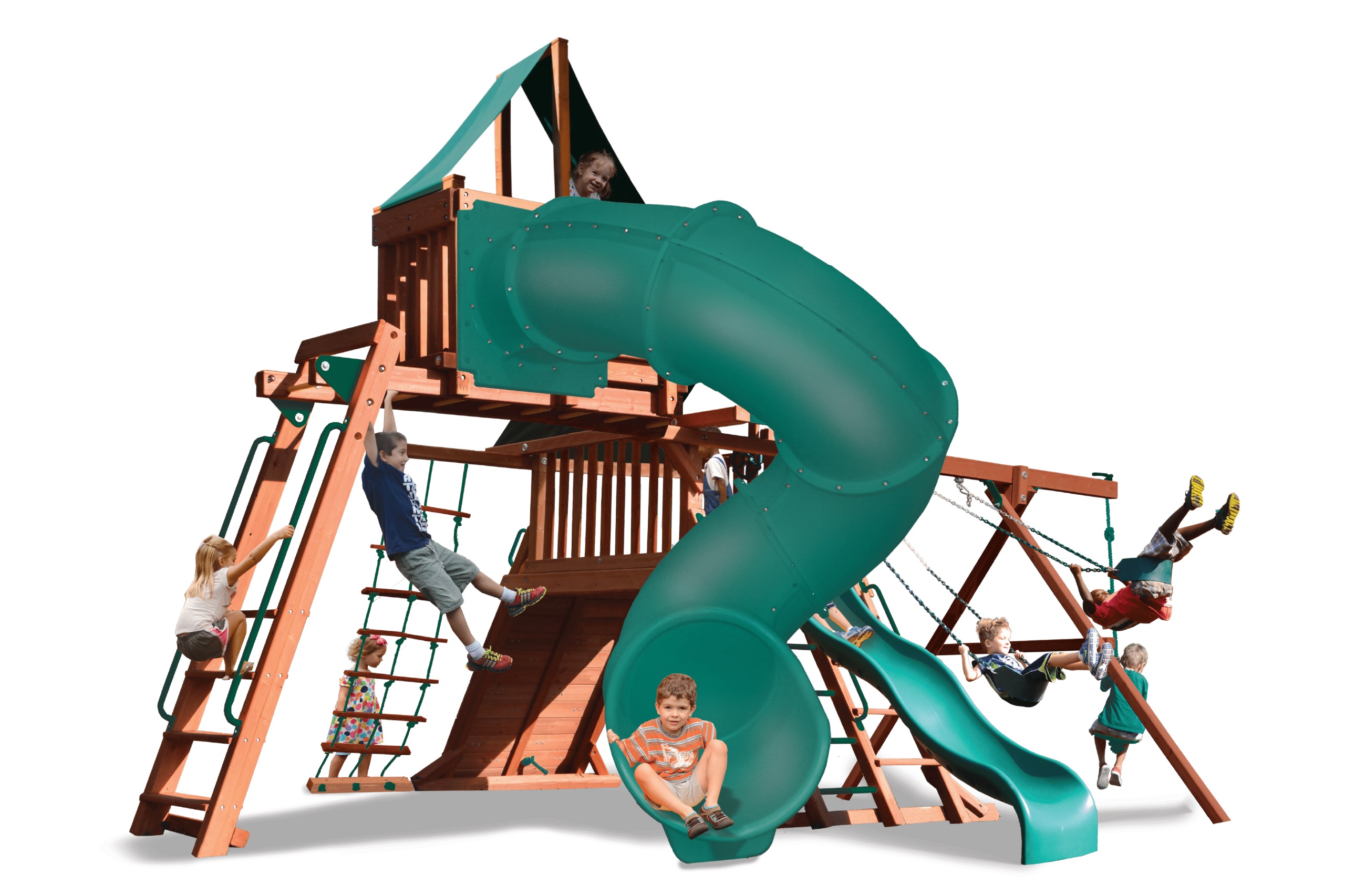Includes: Two heavy duty canopy roofs, 10′ wave slide, 270° spiral slide, rockwall with climbing rope, rope ladder, step/rung ladder with handrails, swing beam with 3 belt swings, accessory arm with trapeze bar, 360° tire swing, monkey bars, sky loft, ships wheel and safety handles.