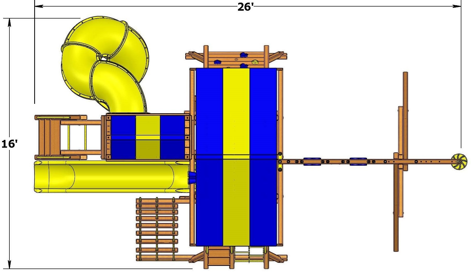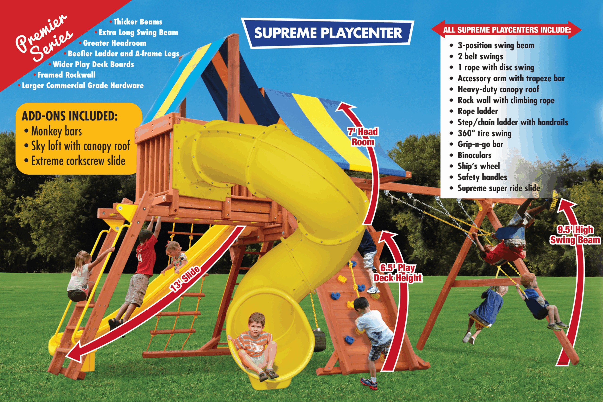 Includes: Two heavy duty canopy roofs, 13′ super slide, rockwall with climbing rope, rope ladder, step/chain ladder with handrails, swing beam with 2 belt swings and knotted rope with disc, grip-n-go bar, 360° tire swing, monkey bars with handrails, sky loft, 270° spiral slide, ships wheel and safety handles.