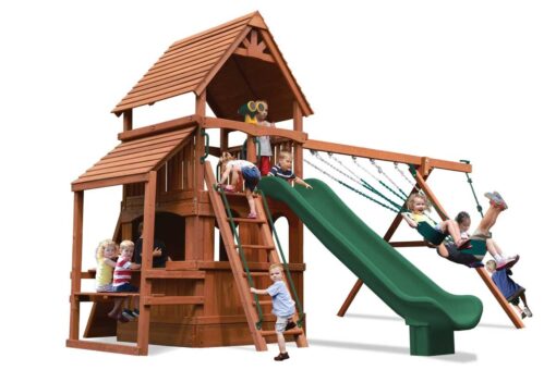 Includes: Wood roof, 11′ slide, rockwall with climbing rope, step ladder with handrails, 4 position swing beam with 3 belt swings and knotted rope and disc, grip-n-go bar, cafe table, lower level enclosure with floor, ships wheel and safety handles.