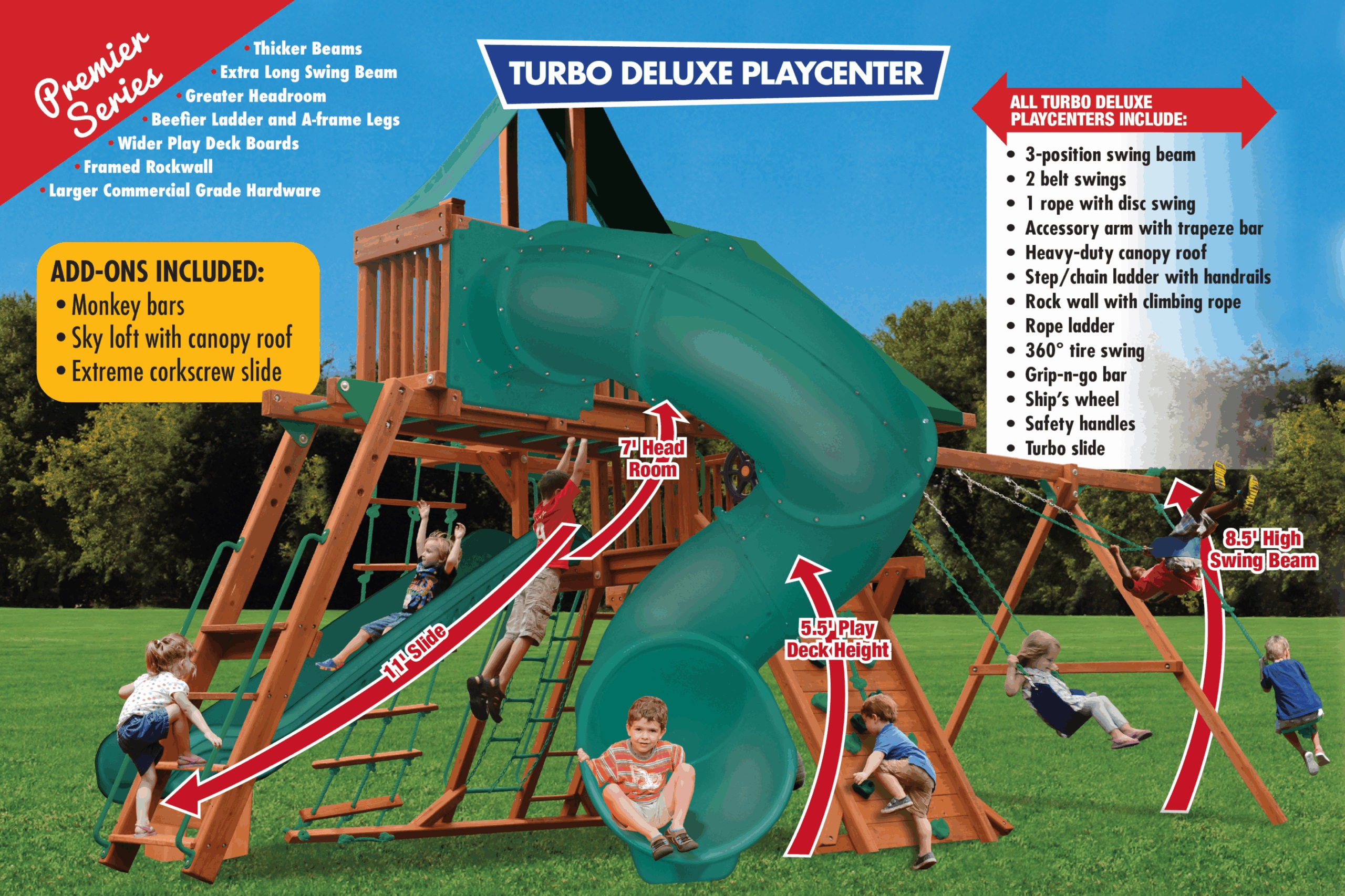 Includes: Heavy duty canopy roof, 11′ slide, grip-n-go bar, rockwall with climbing rope, rope ladder, step/chain ladder with handrails, swing beam with 2 belt swings and knotted rope with disc, 360° tire swing, monkey bars, sky loft, 360° spiral slide, ships wheel and safety handles.