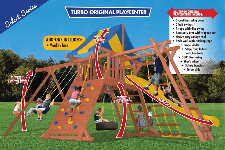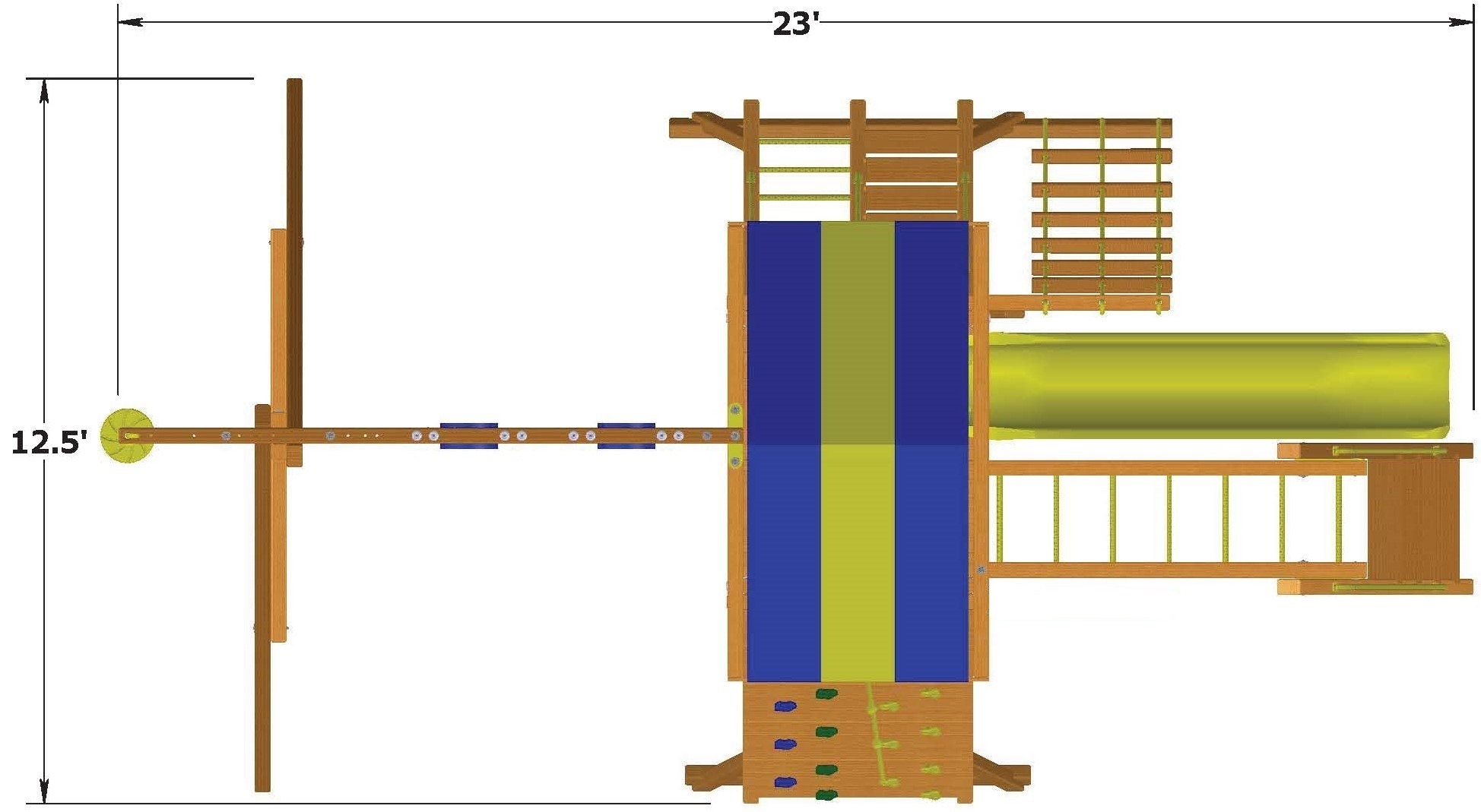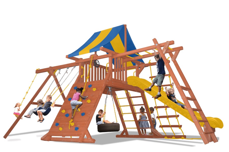 Includes: Heavy duty canopy roof, 11′ wave slide, rockwall with climbing rope, rope ladder, step/rung ladder with handrails, swing beam with 2 belt swings, rope n disc swing, 360° tire swing, monkey bars, ships wheel and safety handles.